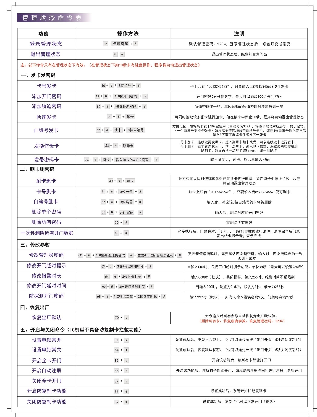 該門禁機(jī)最大可存儲10000組開門數(shù)據(jù)信息(包括感應(yīng)卡開門數(shù)據(jù)、密碼開門數(shù)據(jù)、感應(yīng)卡+密碼開門數(shù)據(jù)),并且所有存儲信息不會因電源斷電而丟失,同時(shí)支持門鈴輸出,可配套有線門鈴使用。